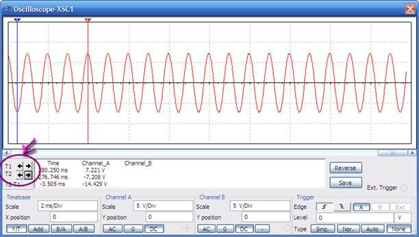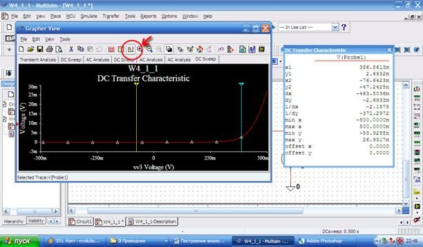 С помощью показанной на рисунке кнопки панели свойств вызываются курсоры. Они позволяют посмотреть координаты каждой точки построенного графика. Вся информация отображается в специальном окне Transfer Characteristics. При перемещении курсоров данные в этом окне также изменяются.