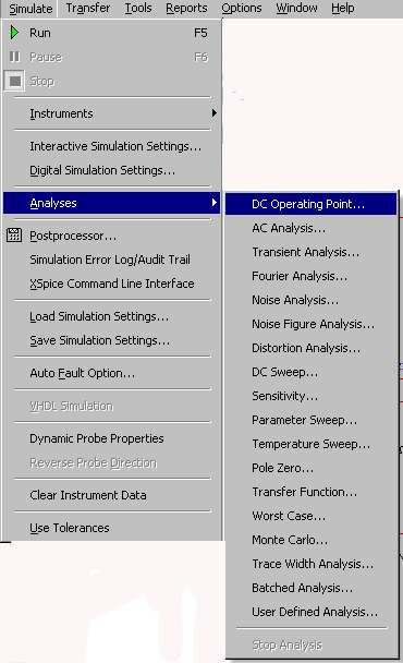 Чтобы начать анализ, выберите пункт меню Simulate Analyses и выберите требуемый режим.