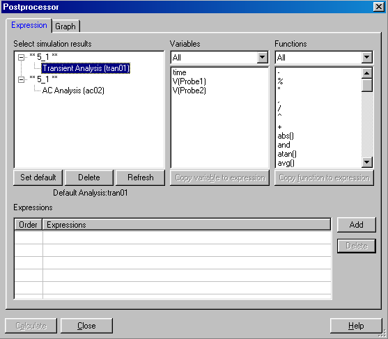 Данная функция позволяет строить необходимые графики после проведенного анализа. Для работы с функцией Postprocessor необходимо знать названия узлов. Только те параметры (входные и выходные переменные), которые указываются при выполнении любого вида анализа (AC Sweep, DC Sweep, Transient Analysis и т.д.) отображаются на графиках функции Postprocessor и Grapher.