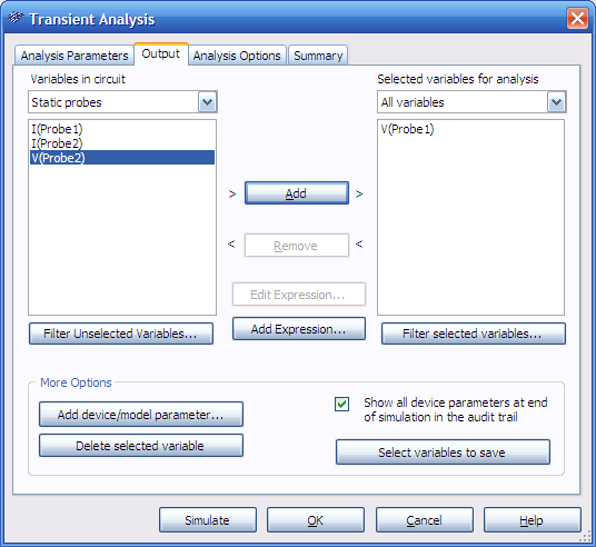 В окне Transient Analysis на вкладке Output выбираем необходимые для анализа величины, выделяем их и нажимаем кнопку Add.