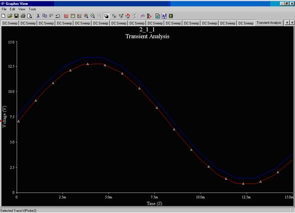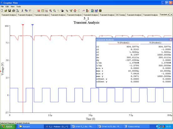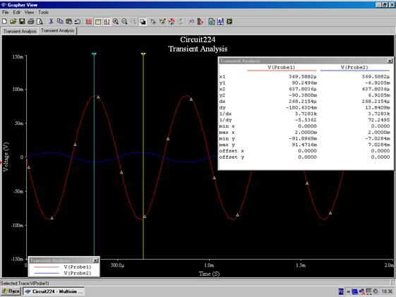 С помощью кнопки плоттера отображение курсоров и данных можно посмотреть значение напряжений в любой точке. При анализе графики для удобства отображаются разными цветами.