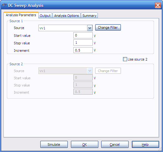 На вкладке Analysis Parameters можно установить источник, для которого строится характеристика. Если поставить флажок Use source 2, получим две характеристики для двух источников на одном графике.