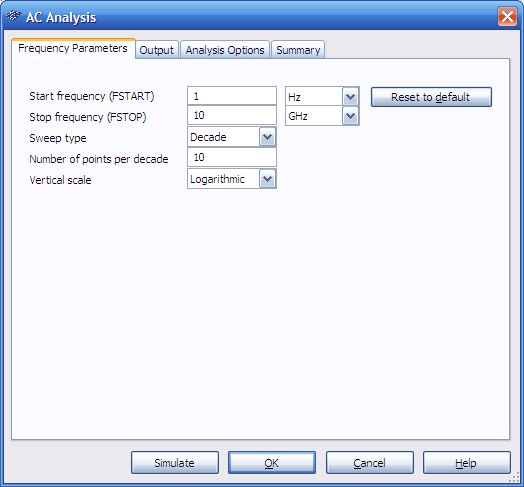 На вкладке Analysis Parameters можно установить начальную и конечную частоты (FSTART и FSTOP соответственно), тип амплитуды графика (Sweep type), количество отображаемых точек и тип вертикальной шкалы (Vertical scale).