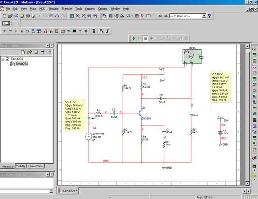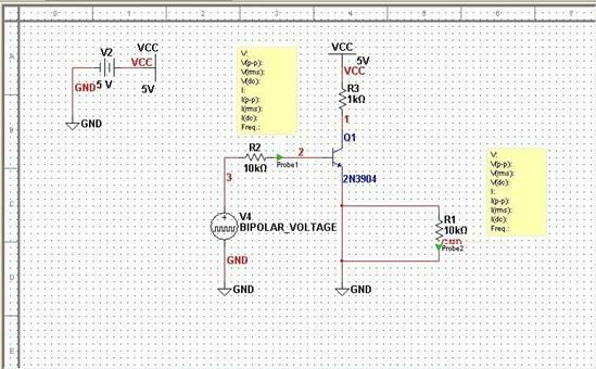 Для примера рассмотрим усилительный каскад на биполярном транзисторе, включенным в схему с общим эмиттером. Построим графики зависимости выходного и входного напряжений от времени, передаточную характеристику, амплитудно-частотную и фазо-частотную характеристики.