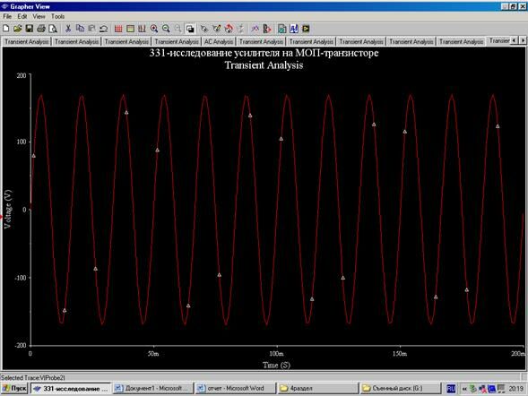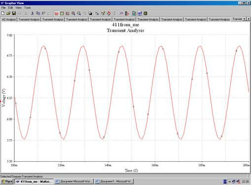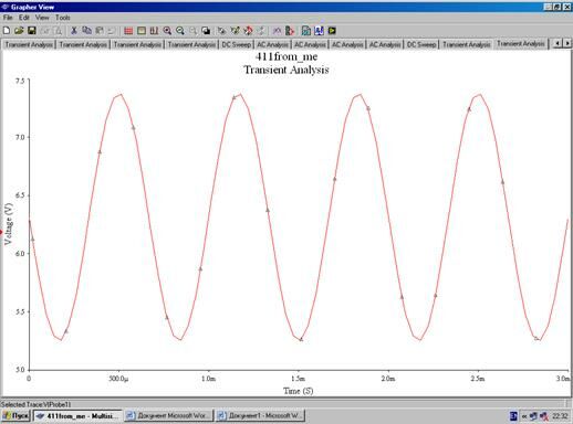 После того, как вы выбрали нужные величины в качестве выходных параметров и установили временной интервал, можно нажимать кнопку Simulate. Если все сделано верно, увидите корректный график. В данном режиме можно построить, например, амплитуду входного (выходного) напряжения.
