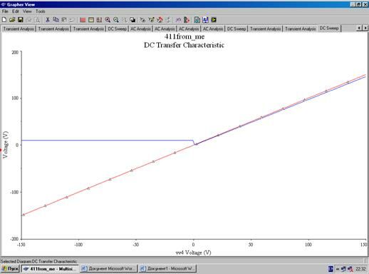 3) С помощью режимов AC-Analysis, Transient Analysis и DC-Sweep Analysis строим графики АЧХ, амплитуды входного (выходного) напряжения и передаточную характеристику соответственно.