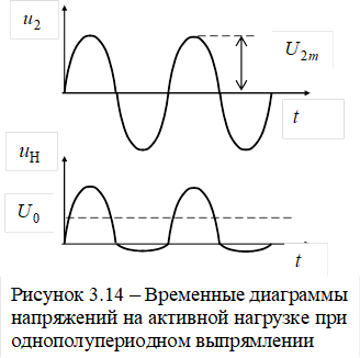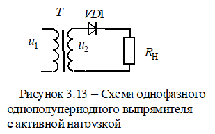Однополупериодный однофазный выпрямитель с активной нагрузкой изображен на рисунке 3.13, а временные диаграммы его работы – на рисунке 3.14