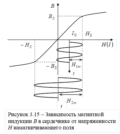 На рисунке 3.15 представлена зависимость магнитной индукции В в сердечнике трансформатора от напряженности Н намагничивающего поля. В рабочем режиме значение магнитной индукции не может превышать индукции насыщения