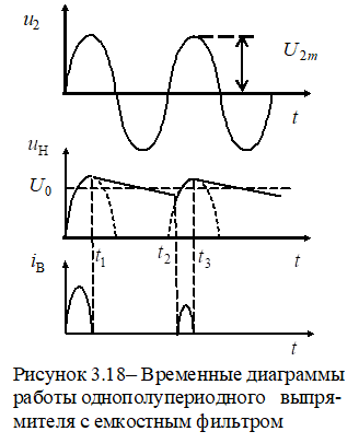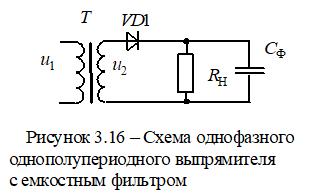 Из-за высокого уровня пульсаций схема с активной нагрузкой используется редко, чаще используется нагрузка с емкостным фильтром. Однополупериодный однофазный выпрямитель с емкостным фильтром нагрузки изображен на рисунке 3.16, а временные диаграммы его работы – на рисунке 3.17.