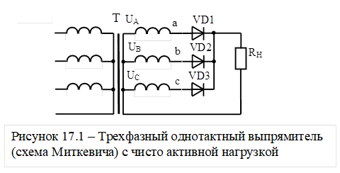 Наиболее простым для анализа является работа на чисто активную нагрузку. Рассмотрим особенности этого режима на примере однотактного выпрямителя для трехфазной сети переменного тока, выполненного по схеме Миткевича.