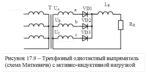 В трехфазных выпрямителях с большими токами нагрузки чаще всего используются индуктивные фильтры (рисунок 17.9)