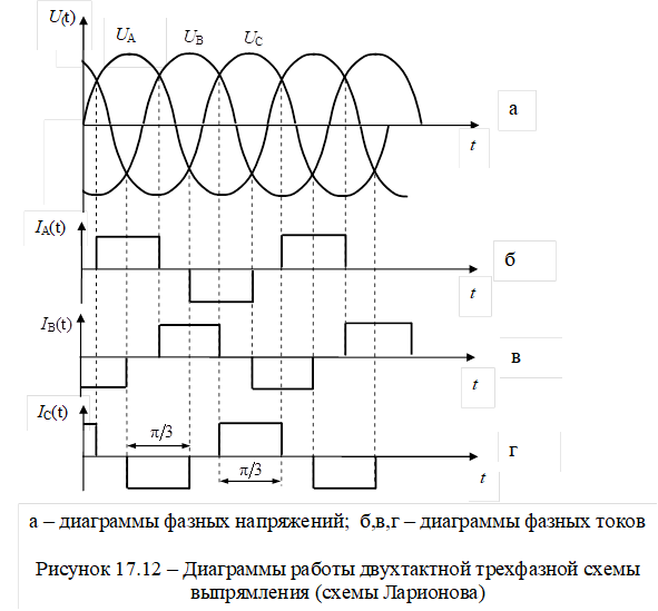 В этой схеме к нагрузке приложено линейное напряжение, и ток протекает в любой момент времени в двух фазах, причем положительное направление ток имеет в фазе с наибольшим потенциалом, а отрицательное – в фазе с наименьшим потенциалом (рисунок 17.12). Поскольку напряжение в фазах изменяется от положительного до отрицательного значения, ток в каждой фазе в интервале времени