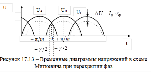 Кроме того, в многофазных схемах выпрямления за счет внутреннего сопротивления возникает перекрытие фаз, т. е. их одновременная работа (рисунок 17.13). Положительные значения ЭДС в фазах вторичных обмоток оказываются больше выпрямленного напряжения