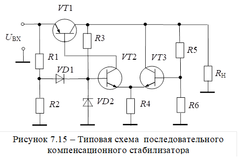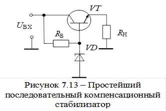 Принципиальная схема простейшего последовательного компенсационного стабилизатора напряжения изображена на рисунке 7.13.