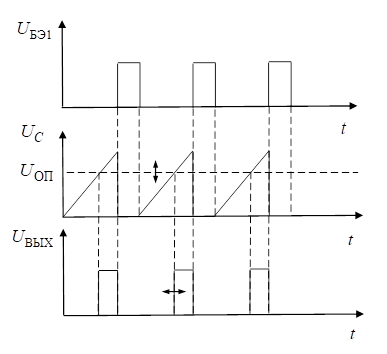 VT1, R1, R2, R3 – генератор стабильного тока, который заряжает C.