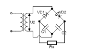 2. в течение второго полупериода (+/-) VD1 запирается и начинается заряжаться С2 до