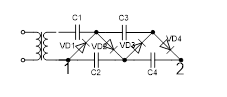 4. в течение четвертого полупериода включается VD2 и VD4, в результате С2 заряжается до