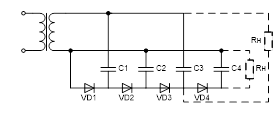 Каждый последующий каскад увеличивает суммарное напряжение на Um: ∆U= Um. По сравнению с предыдущей схемой данная схема обладает меньшим Rвых, следовательно, больше токи на выходе. Недостатком схемы – каждый последующий конденсатор должен быть рассчитан на большее напряжение: Uвых. макс.=n·Um, где n – число каскадов умножения.