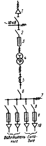 1 - высоковольтный кабель; 2 - разъединитель; 3 - плавкие предохранители высокого напряжения; 4 - силовой трансформатор; 5 - трансформатор тока; 6-рубильники или выключатели; 7 - сборные шины низкого напряжения; 8 - рубильники; 9 - плавкие предохранители низкого напряжения; 10 - кабели к нагрузке.