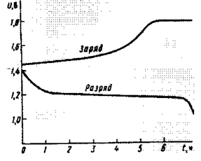 Электродвижущая сила щелочных аккумуляторов ниже, чем у кислотных, у полностью заряженного НК-аккумулятора ЭДС составляет 1,30...1,35 В; у НЖ-аккумулятора – 1,35…1,40 В. Кривые изменения напряжения на зажимах НК-аккумулятора при его разряде и заряде показаны на рис 1.4.