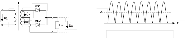Рис. 35. Двухполупериодный выпрямитель с выводом средней точки обмотки трансформатора