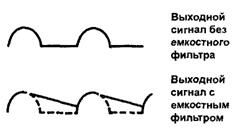 Фильтрацию выпрямленного напряжения осуществляют обычно путем подключения к выходу выпрямителя сглаживающих ф и л ь т р о в. Виды выходных сигналов однополупериодного выпрямителя без фильтра и с простейшим емкостным фильтром приведены на рисунке ниже.