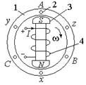 Электрическую энергию трехфазного тока получают в синхронных трехфазных генераторах (рис. 27). Три обмотки 2 статора 1 смещены между собой в пространстве на угол 120°. Их начала обозначены буквами А, В, С, а концы – x, y, z. Ротор 3 выполнен в виде постоянного электромагнита, магнитное поле которого возбуждает постоянный ток I, протекающий по обмотке возбуждения 4. Ротор принудительно приводится во вращение от постороннего двигателя. При вращении магнитное поле ротора последовательно пересекает обмотки статора и индуктирует в них ЭДС, сдвинутые (но уже во времени) между собой на угол 120°.