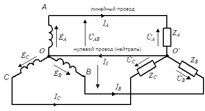 В генераторах трехфазного тока электрическая энергия генерируется в трех одинаковых обмотках, соединенных по схеме звезда. Чтобы сэкономить на проводах линии передачи электроэнергии от генератора к потребителю тянутся только три провода. Провод от общей точки соединения обмоток не тянется, т.к. при одинаковых сопротивлениях нагрузки (при симметричной нагрузке) ток в нем равен нулю.