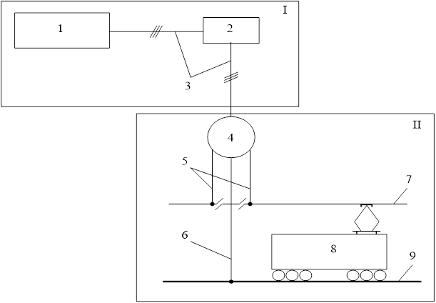 Внешняя система электроснабжения (I) включает в себя электрическую станцию 1, трансформаторную подстанцию 2, линию электропередачи 3. Тяговая система электроснабжения (II) содержит тяговую подстанцию 4, питающие фидеры 5, отсасывающий фидер 6, контактную сеть 7 и тяговый рельс 9 (см. рис. 1.3), а также линейные устройства.