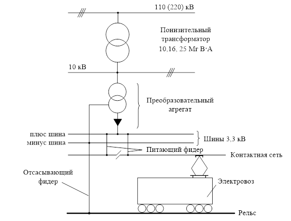 Питание тяговой сети в большинстве случаев осуществляется от шин 110 (220) кВ через понизительный трансформатор, который обеспечивает снижение напряжения до 10 кВ. К шинам 10 кВ подключен преобразователь, который состоит из тягового трансформатора и выпрямителя. Последний обеспечивает преобразование переменного тока в постоянный напряжением на шинах 3,3 кВ. Контактная сеть подключается к «плюс шине», а рельсы – к «минус шине».