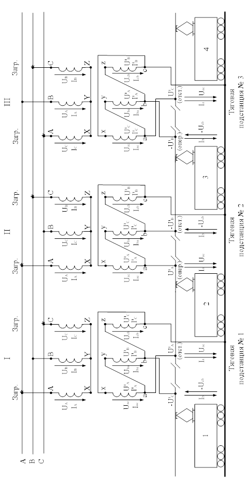 К сожалению, подключение группы тяговых подстанций к линии электропередачи с использованием чередования фаз не решает всей проблемы несимметрии тока и напряжения. Эти вопросы будут рассмотрены особо.