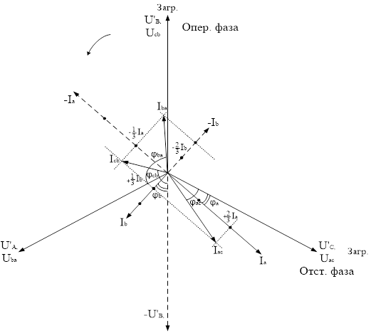 Изобразим на диаграмме векторы напряжений и токов Iл, Iп. Ток в обмотках «ах», исходя из изложенного, должен равняться сумме