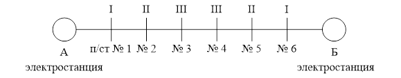 Если питание ЛЭП одностороннее, то цикл из трех подстанций с разным чередованием фаз обеспечивает их равномерную нагрузку на участке между источником электрической энергии и первой подстанцией (рис.1.11). Генераторы электрической станции будут работать в нормальном режиме симметричной нагрузки. Потери мощности напряжения ЛЭП уменьшаются из-за уменьшения неравномерности нагрузки.