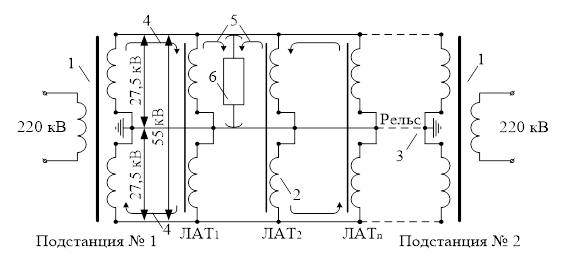 220/25 кВ; 2 – линейные автотрансформаторы 50/25 кВ мощностью 16 мВ∙А, устанавливаемые между подстанциями через 10 – 20 км; 3 – подключение рельсов в средней точке понизительного трансформатора и линейного автотрансформатора (ЛАТ); 4 – поток мощности при U = 50 кВ; 5 – при U = 25 кВ; 6 – электровоз