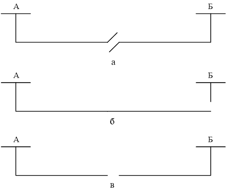 Однопутный участок (см. рис. 1.17). Контактная сеть делится на две секции (изолирующим сопряжением или нейтральной вставкой), и каждая секция питается от подстанции через свой питающий фидер. При повреждении какой-либо секции отключается только эта секция (рис. 1.17,а). При консольной схеме (рис. 1.17,б) участок питается от одной подстанции с одной стороны. При повреждении питание снимается со всего участка. При встречно-консольной схеме (рис. 1.17,в) участок питается от одной подстанции с одной стороны. На каждом участке – свой питающий фидер. В случае отключения одной из подстанций участок оказывается без питания.