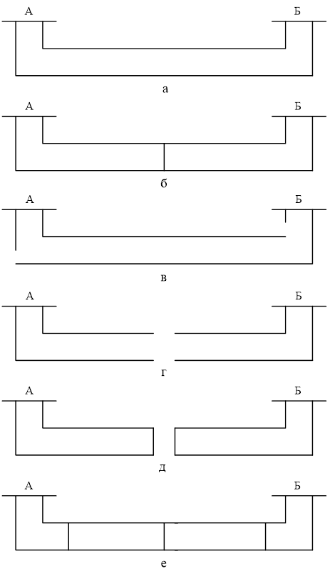 Консольная схема (рис.1.18,в) обеспечивает питание каждого пути отдельно от разных подстанций. Недостатки здесь те же, что и в аналогичной схеме однопутного участка. Встречно-консольная схема (рис.1.18,г) дает возможность разделить межподстанционную зону на участки, которые электрически между собой не связаны. Каждый путь питается своим фидером. При отключении фидера участок оказывается без напряжения. Увеличиваются потери электрической энергии. Встречно-кольцевая схема (рис.1.18,д) позволяет питать участки по кольцу от двух подстанций, что снижает потери электрической энергии и повышает надежность. Параллельная схема (рис.1.18,е) питания получила наибольшее распространение. При такой схеме контактная сеть питается от двух подстанций с двух сторон. Поскольку контактная подвеска обоих путей электрически связана между собой, ее сечение увеличивается, что приводит к снижению потерь электрической энергии. Вместе с тем параллельная схема питания отличается высокой надежностью по сравнению с другими схемами.