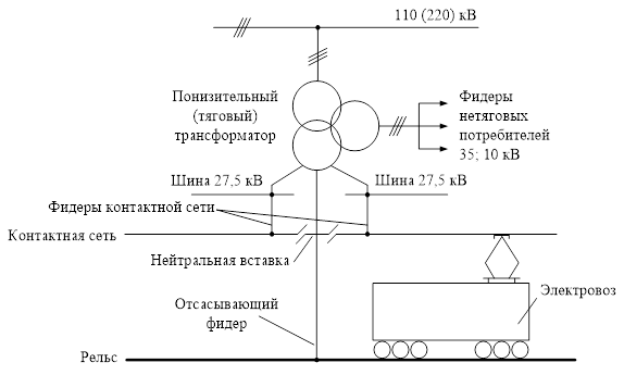тяговой части системы электроснабжения, состоящей из тяговых подстанций линейных устройств и тяговой сети. Тяговая сеть, в свою очередь, состоит из контактной сети, рельсового пути, питающих и отсасывающих линий (фидеров), а также других проводов и устройств, присоединяемых по длине линии и контактной подвески непосредственно или через специальные автотрансформаторы.