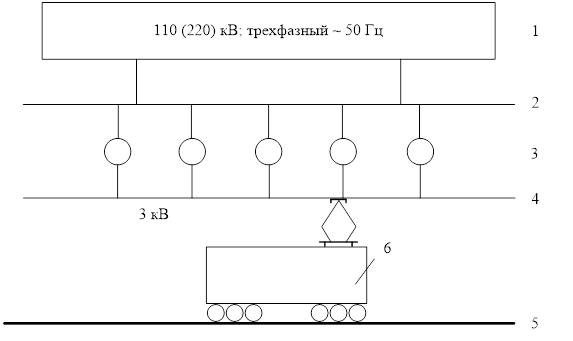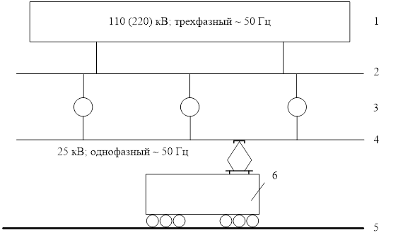 Рис. 1.5. Принципиальная схема питания электрифицированного участка железной дороги переменного тока напряжением в контактной сети 25 кВ, частотой 50 Гц