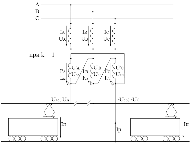 При питании тяговой нагрузки от трех фаз секции тяговой сети слева и справа от подстанции должны питаться от разных фаз. Следовательно, они имеют напряжения, не совпадающие по фазе друг с другом.