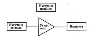 Электронным усилителем называют устройство, в котором входной сигнал напряжения или тока используется для управления током (а следовательно, и мощностью), поступающим от источника питания в нагрузку. Обобщенная схема включения усилителя приведена на рис. 18.1.