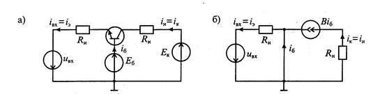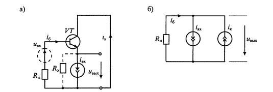 Рис. 18.7. Схема повторителя тока (а) и его схема замещения (б)
