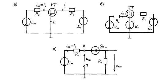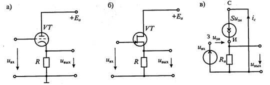 Рис 18 8. Схема повторителя тока на полевом транзисторе (а), на электронной лампе (б) и схема его замещения (в)