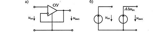 Рис. 18.6. Схема повторителя напряжения на операционном усилителе (а) и его схема замещения (б)