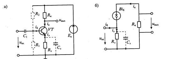 Рис. 18.9. Однокаскадный усилитель напряжения на биполярном транзисторе (а) и его схема замещения для малого сигнала (6)