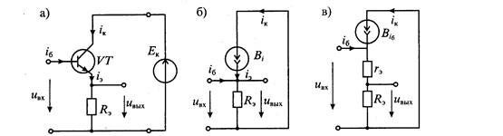 Рис. 18.3. Схема эмиттерного повторителя (а), схема замещения для малого сигнала (б), схема замещения с учетом внутреннего сопротивления эмиттера (в)