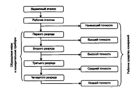 В самом общем виде метрологическая цепь передачи размеров единиц физических величин показана на рис. 1. Представленная на рис. 1 схема имеет строгую иерархию: передача размеров между эталонами идет сверху вниз: от первичного эталона к рабочим, от рабочих к образцовым мерам и измерительным приборам 1-го разряда и т.д., т.е. нижележащие образцовые средства измерений поверяются по находящимся на ступень выше. Рабочие меры и измерительные приборы поверяются по образцовым, имеющим соответствующую точность. Все образцовые средства измерений подлежат обязательной поверке в сроки, устанавливаемые правилами Федерального агентства по техническому регулированию и метрологии (Ростерегулирования).