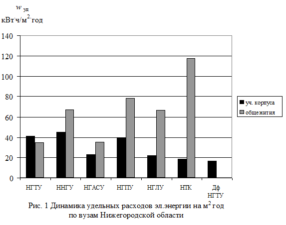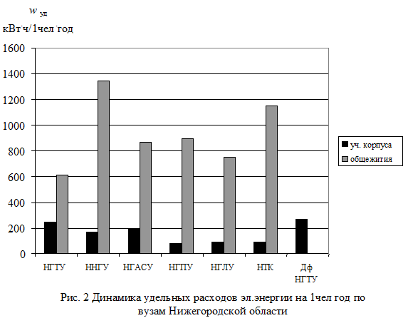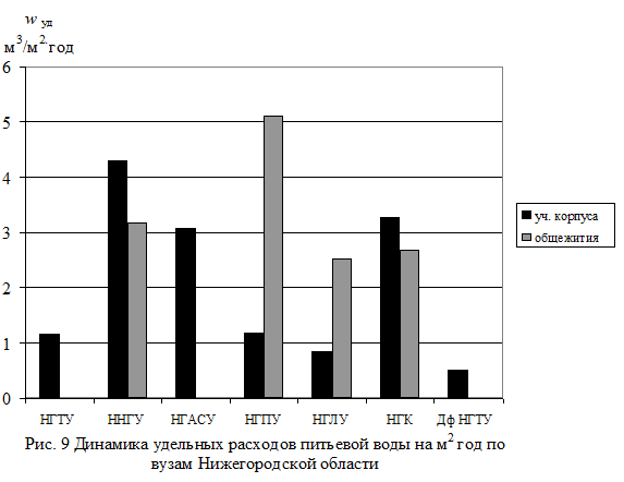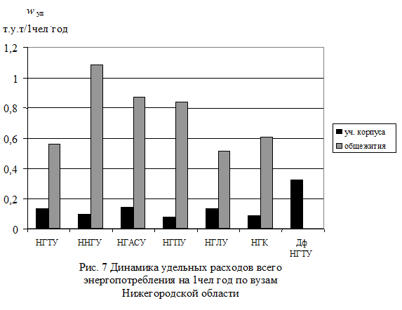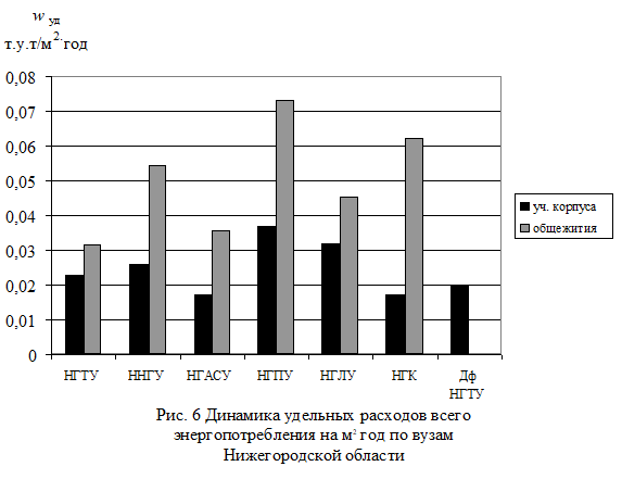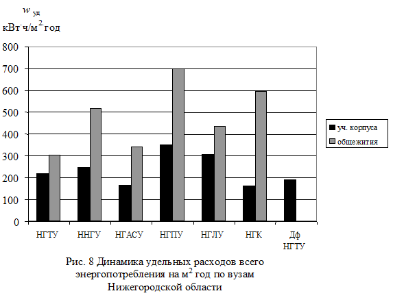 В табл. 3 приведены сведения о полных и удельных расходах энергоносителей по Вузам Нижегородского региона. Удельные расходы определялись на 1 м2 площади в год и на 1 человека в год. На рис. 1 - 11 приведены диаграммы удельных расходов всего энергопотребления, электрической и тепловой энергии, газа и питьевой воды обследованных вузов, отдельно по учебным корпусам и общежитиям.