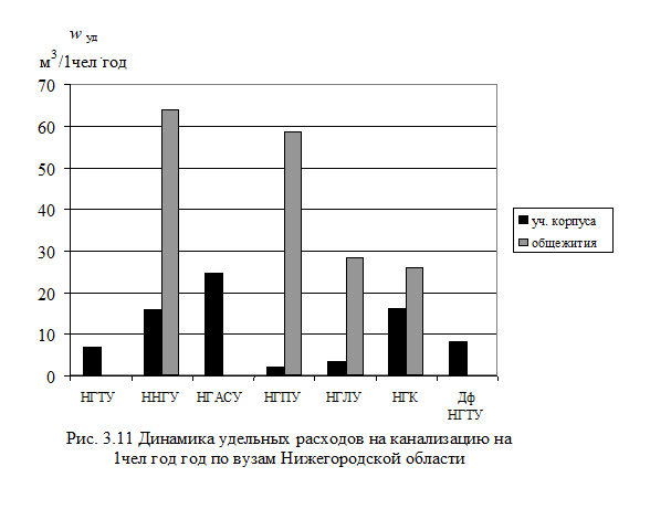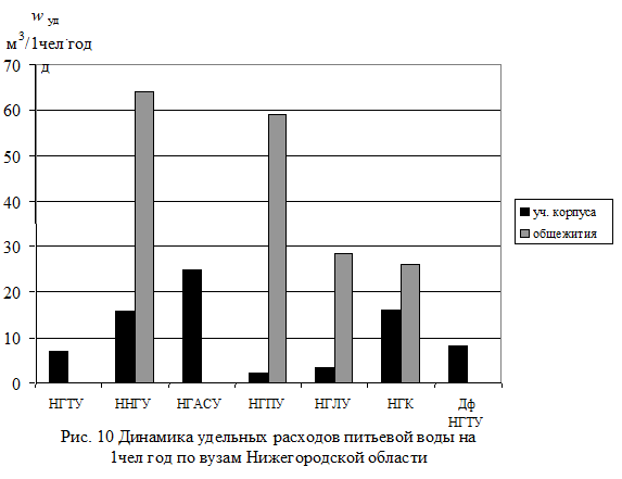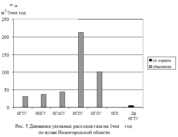 Из табл. 3 и рис. 1 - 11 видно, что удельные расходы энергоносителей на 1 чел. в год по Вузам Нижегородской области составляют: