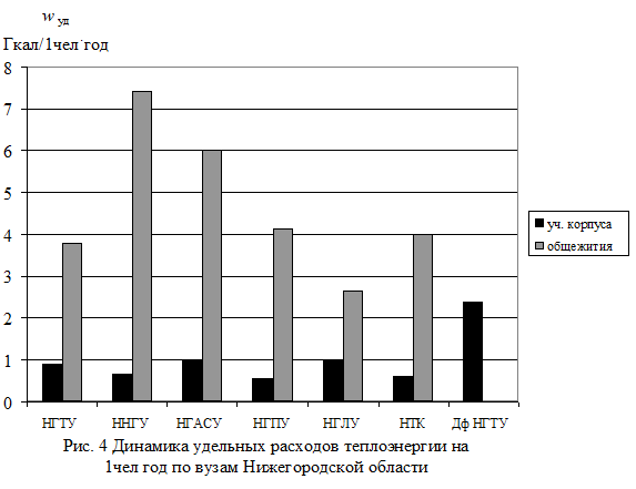 Нормирование удельных расходов на 1 м2 площади применяется во многих странах и является объективной величиной, которая обычно связывается с требованиями санитарно-гигиенических норм. Однако в переходный период нашей экономики, когда многие ученые учреждения сдают свои площади в аренду, этот показатель дает завышенные цифры необходимых энергоносителей. Поэтому для переходного периода более достоверным будет нормирование удельных расходов 1 учащегося и преподавателя (на1 чел.год). Это позволит поставить все учебные заведения в одинаковые условия, в не зависимости от их площадей, и заставит руководителей учебных заведений более рационально использовать имеющиеся площади.