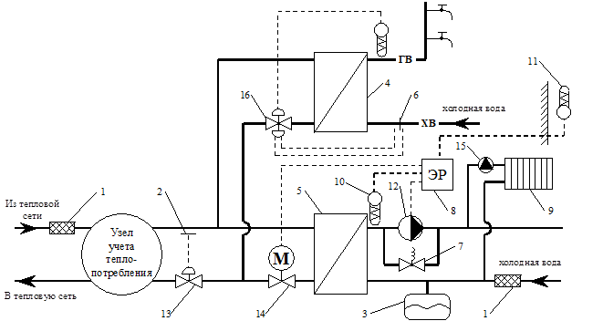 1 - сетчатый фильтр; 2 - датчик давления воды в трубопроводе; 3 - расширительный сосуд; 4 - водоподогреватель системы ГВС; 5 - водоподогреватель системы теплоснабжения; 6 - диафрагменный элемент; 7 - перепускной клапан; 8 - электронный регулятор; 9 - отопительный прибор; 10 - датчик температуры воды в трубопроводе; 11 - датчик температуры наружного воздуха; 12 - насос; 13 - регулятор перепада давления; 14 - регулирующий клапан с электроприводом; 15 - радиаторный терморегулятор; 16 - регулятор температуры с коррекцией по расходу.